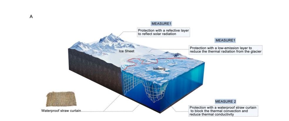 基于上述热传递途径的差异,作者从热调控的角度将冰川分为“陆地冰川”与“海水中的冰川”两类,并针对其分别提出了相应的保护策略:对陆地冰川,采用热反射粉体与低发射率材料复合覆盖的方式,在减少太阳辐射吸收的同时抑制与环境的热辐射交换,从而实现隔热保温;对海水中的冰川,则通过设置水下屏障结构,既阻隔冰体与海水直接接触、降低对流传热,又起到保温作用。实验估算表明,该措施可令陆地冰川融化损失减少20%以上,海水中的冰川融化损失降低50%以上。若将这一方案推广至全球冰冻圈范围内的冰川保护工程,有望至少延迟冰川融化数十年。