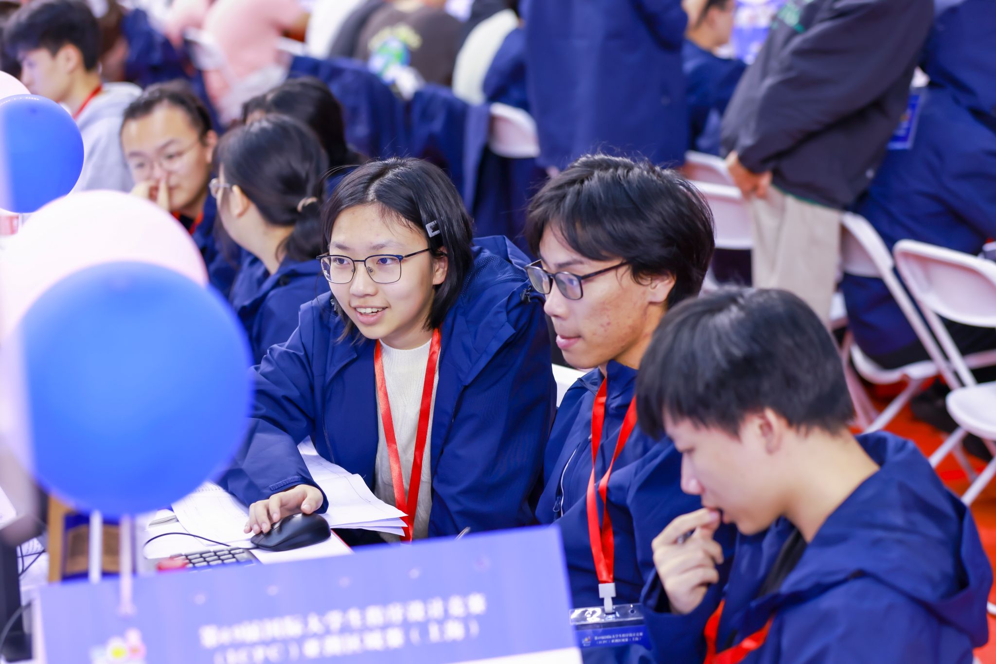 正式比赛于11月17日9:00准时开始,宽敞明亮的体育馆内,数百台电脑整齐排列,每位参赛选手都全神贯注,手指在键盘上跳跃飞舞,将脑海中的算法思路迅速转化为一行行代码,争分夺秒地解决着一个个复杂的问题。比赛开始6分11秒后,来自洛谷科技的参赛队率先解出I题,收获了一支“First Problem Solved”气球。